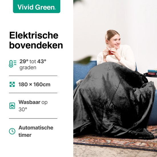 Warm, knus, en volledig ontspannen in de winter met de Vivid Green Elektrische Bovendeken! Geniet van heerlijke warmte met 9 instelbare standen tot wel 43°C en een extra grote maat van 180x160 cm. Perfect voor gezellige avonden op de bank of een ontspannen nacht in bed!
