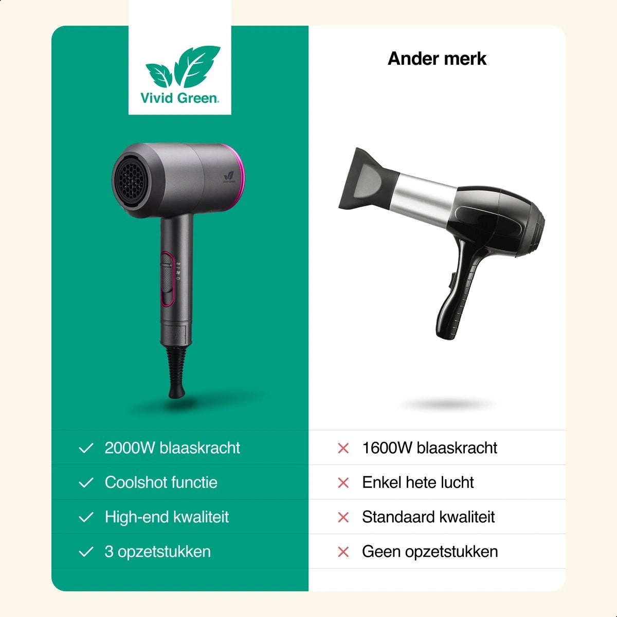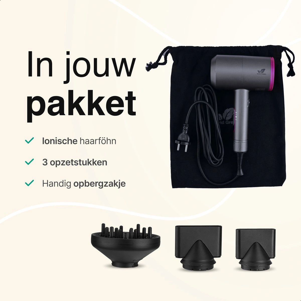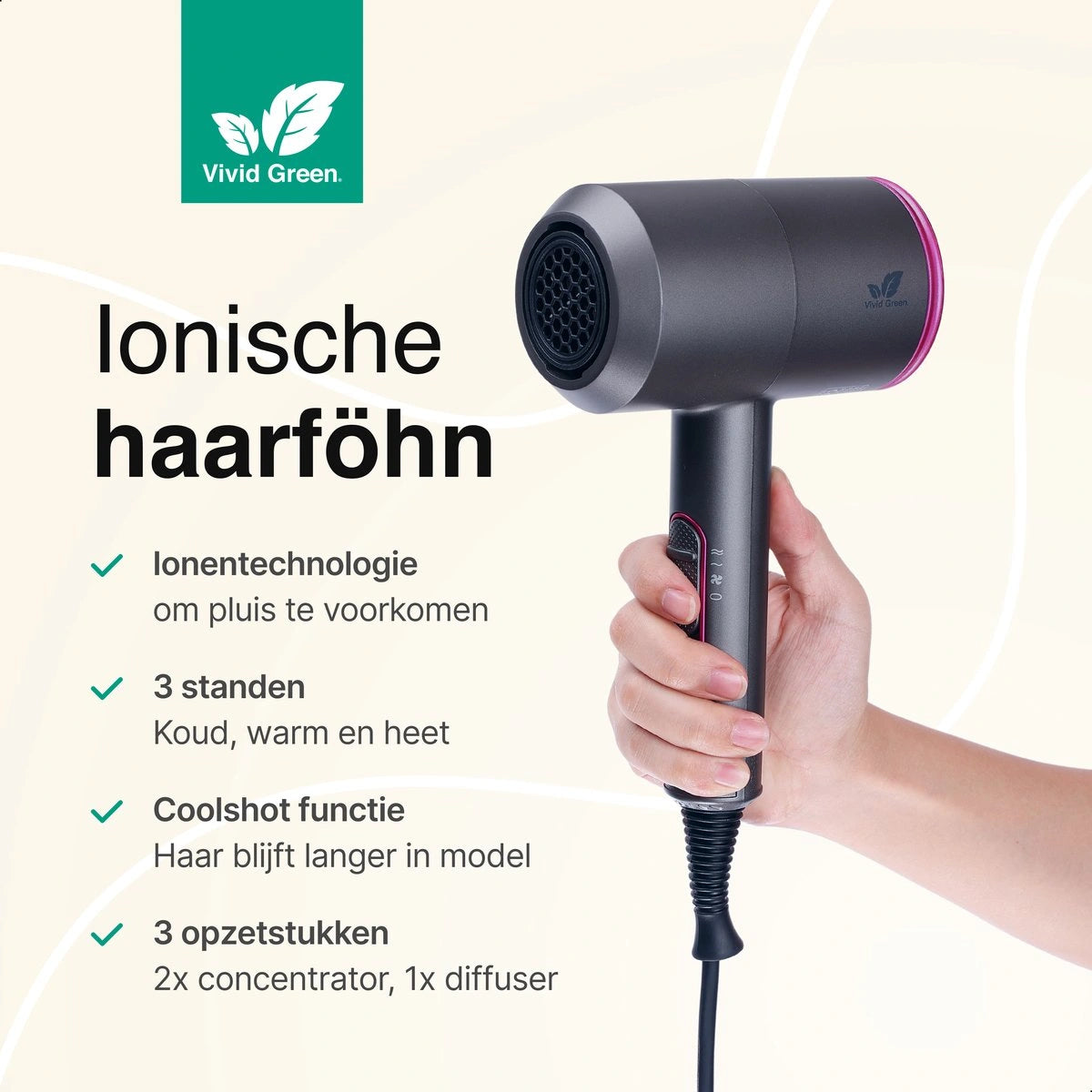 Ben je het wachten zat en wil je snel je haren droog hebben? Dan is de Vivid Green Ionische Haarföhn de oplossing voor jou! De haardroger is voorzien van een krachtige 2000W motor waardoor jij je haren in een mum van tijd droog krijgt! De Föhn met diffuser is voorzien van nieuwe ionentechnologie zodat je sneller kan drogen en stylen en je haar niet wordt beschadigd. Met de bijgeleverde opzetstukken kan jij de haarstijl perfectioneren en een look creëren alsof je net uit de haarsalon komt! Zo heb je altijd en overal mooi, droog en pluisvrij haar