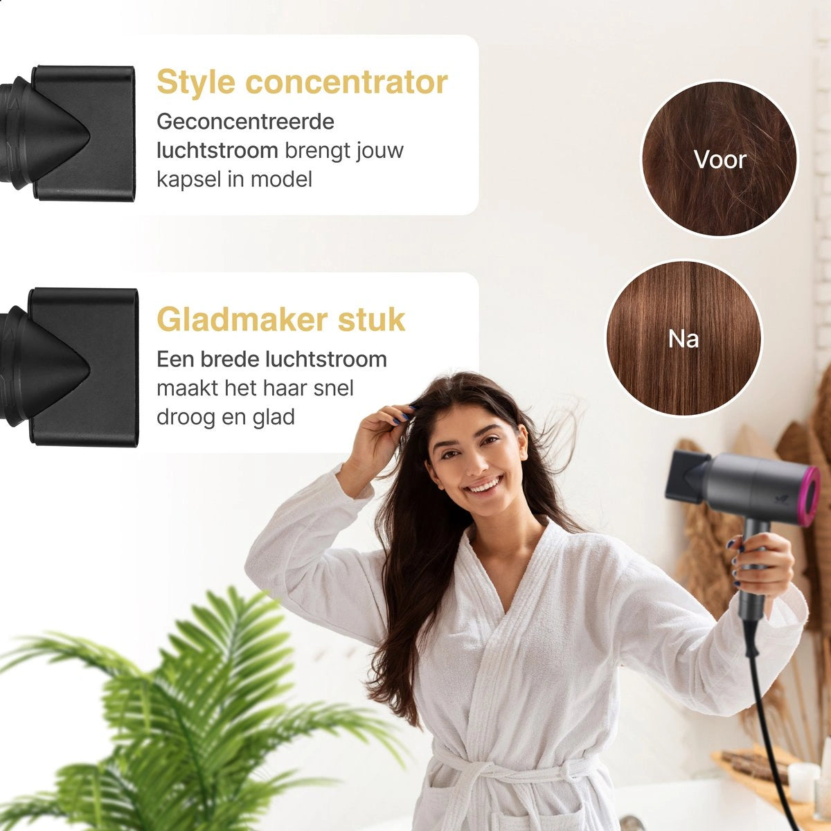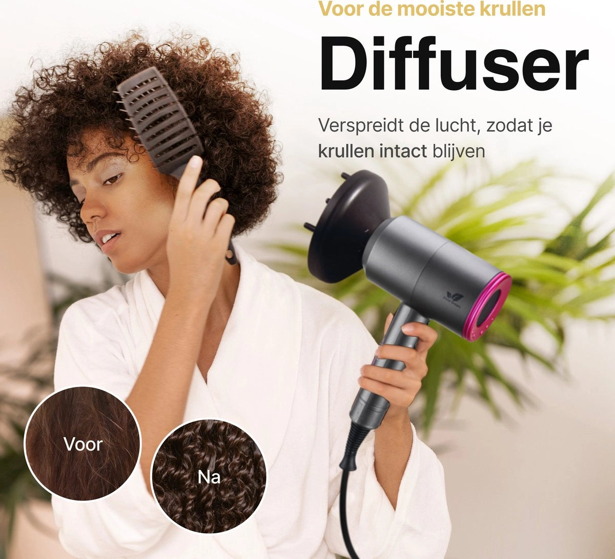 Onze haarföhn is geschikt voor ieder haartype dankzij de temperatuurregelaar en de verschillende opzetstukken. Zo kan je minder warme standen goed gebruiken voor extensions, beschadigd haar en geverfd haar. Gebruik de diffuser om je natuurlijke krullen te drogen en de andere opzetstukken om je haar perfect in model te brengen. Creëer altijd de look die jij wilt!