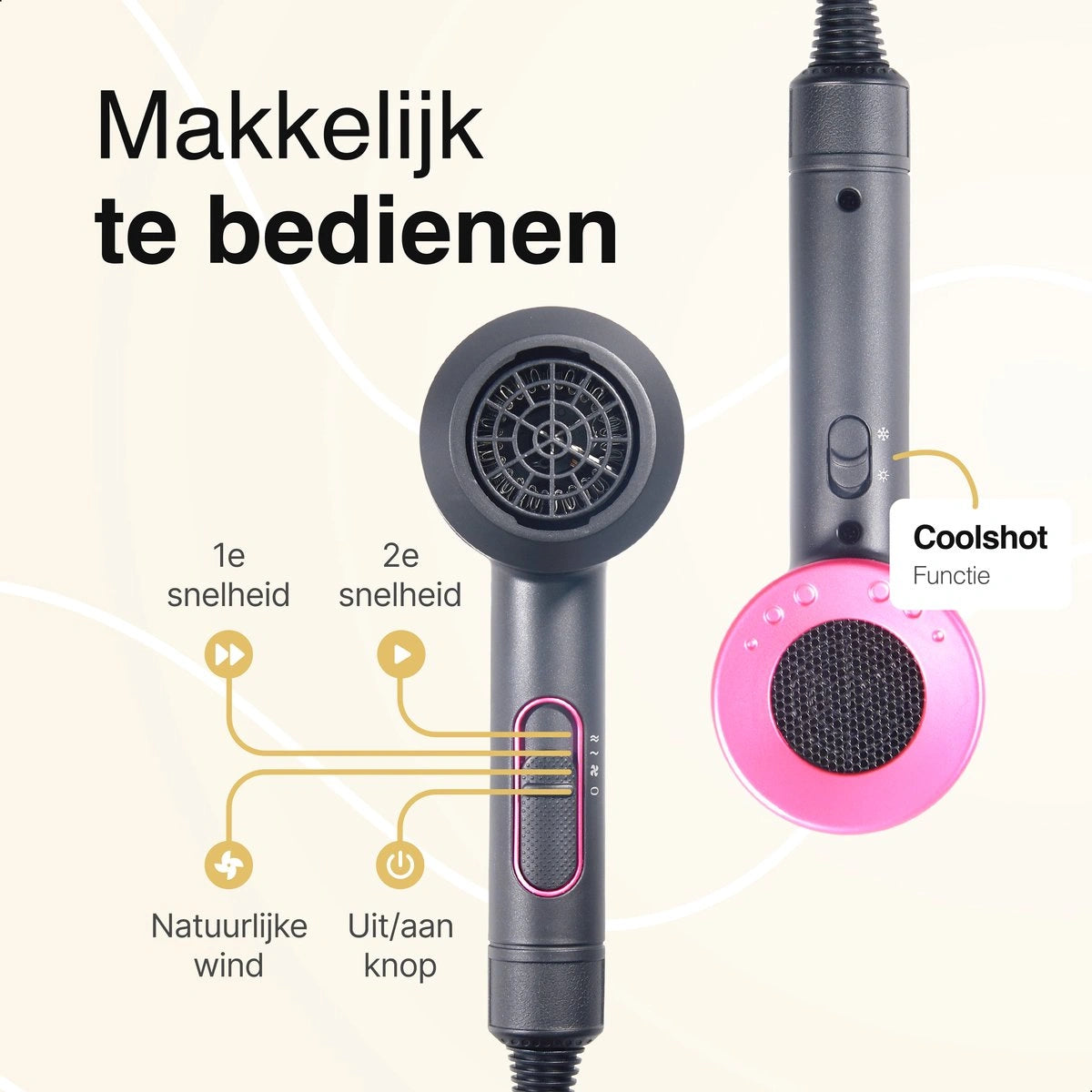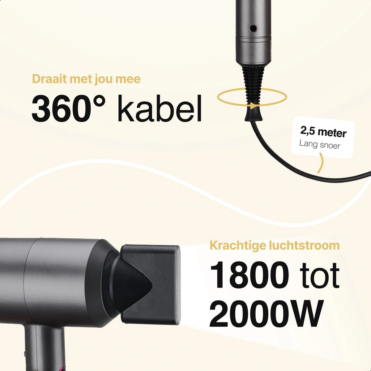 De haardroger heeft een lichtgewicht design, dit zorgt ervoor dat je niet zo snel lamme armen krijgt van al dat föhnen. De 2,5 meter lange kabel kan 360° draaien en zorgt ervoor dat je niet super dicht bij een stopcontact hoeft te zitten. Dankzij het compacte design en het opbergzakje kun je de haarföhn eenvoudig meenemen zonder deze te beschadigen.