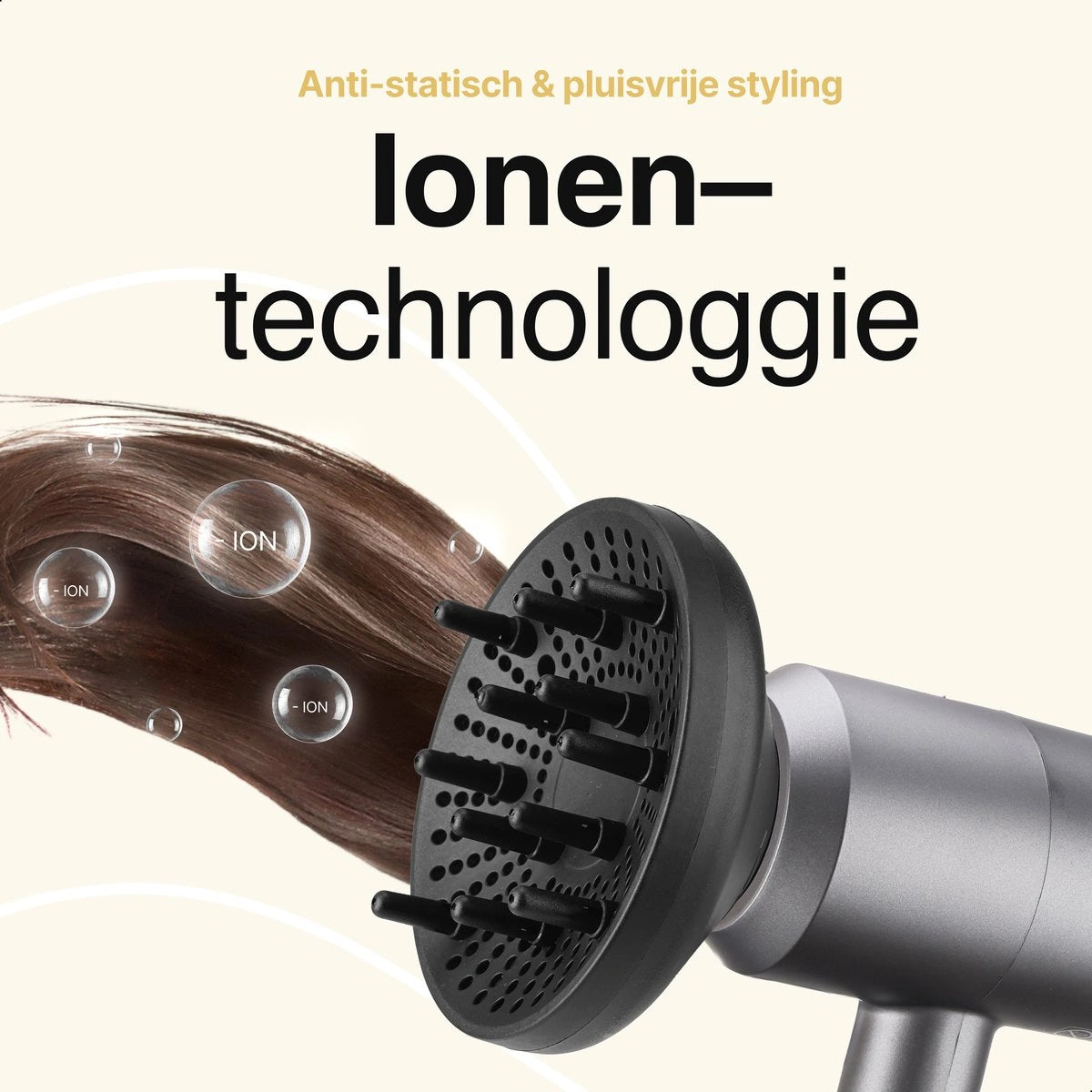 De ionische technologie in onze föhn zorgt ervoor dat jouw haren tijdens het drogen omhult worden door negatieve ionen. Dit betekend dat er als het ware een schild ontstaan voor je haar. Tijdens föhnen worden je haren beschermd tegen warme lucht en worden positief geladen watermolecule sneller afgevoerd. Het drogen zal hierdoor sneller gaan maar het zorgt er ook voor dat je haar niet uitdroogt, niet statisch wordt en zeker niet gaat pluizen!
