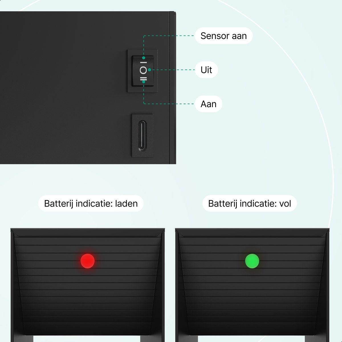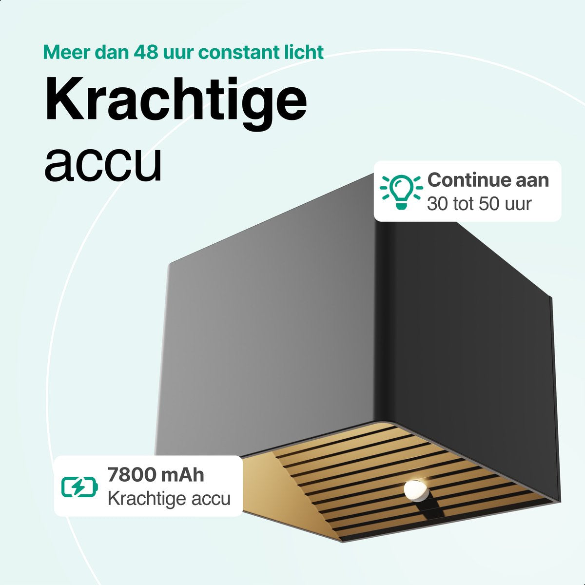 De 7800 mAh accu zorgt ervoor dat je lamp tot wel 60 dagen meegaat in sensor-modus, of tot 50 uur continu brandt. Ideaal voor als je lang van huis bent of geen zin hebt in constant opladen.
